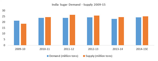 Domestic sugar prices is estimated to have grown at a CAGR of about 3.08% during 2009-15. Sugar pricing has seen a steady increasing behavior because it is regulated by government. As sugar is a sensitive consumer commodity, the movement of sugar pricing is done in a predetermined manner by monitoring domestic production and regulating import/export duties.