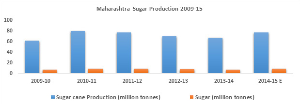 With about 165 operational factories and growing at a CAGR of 2.47% during 2009-15, sugar production in Maharashtra, increased to about 8.8 million tons in 2014-15 from 7.1 million tons in 2009-10.
