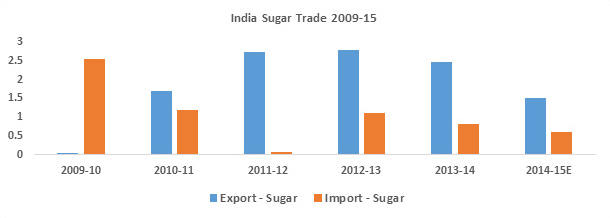 From the trade statistics, it is comprehended that apart from being a producer and consumer of sugar, India also holds a commendable position in export of sugar. The import of sugar is observed to follow a declining pattern because of hiked import duty to safeguard domestic sugar industry.
